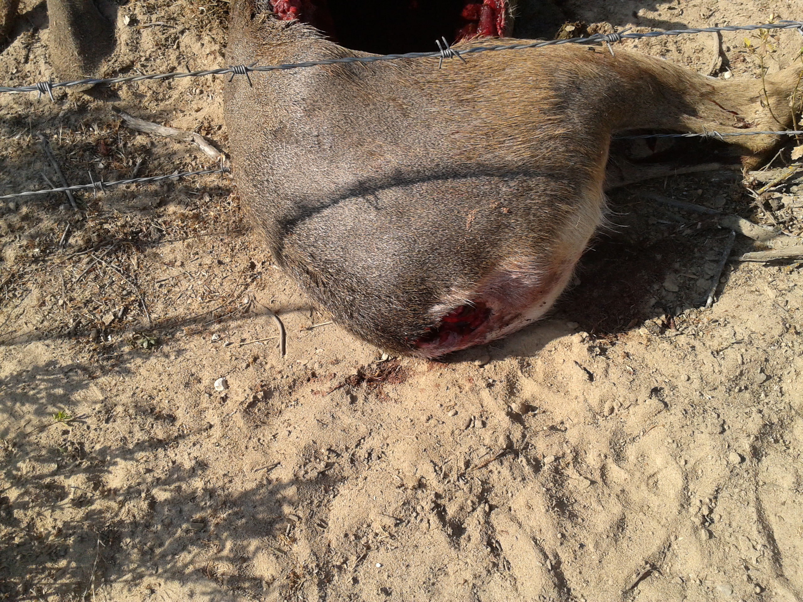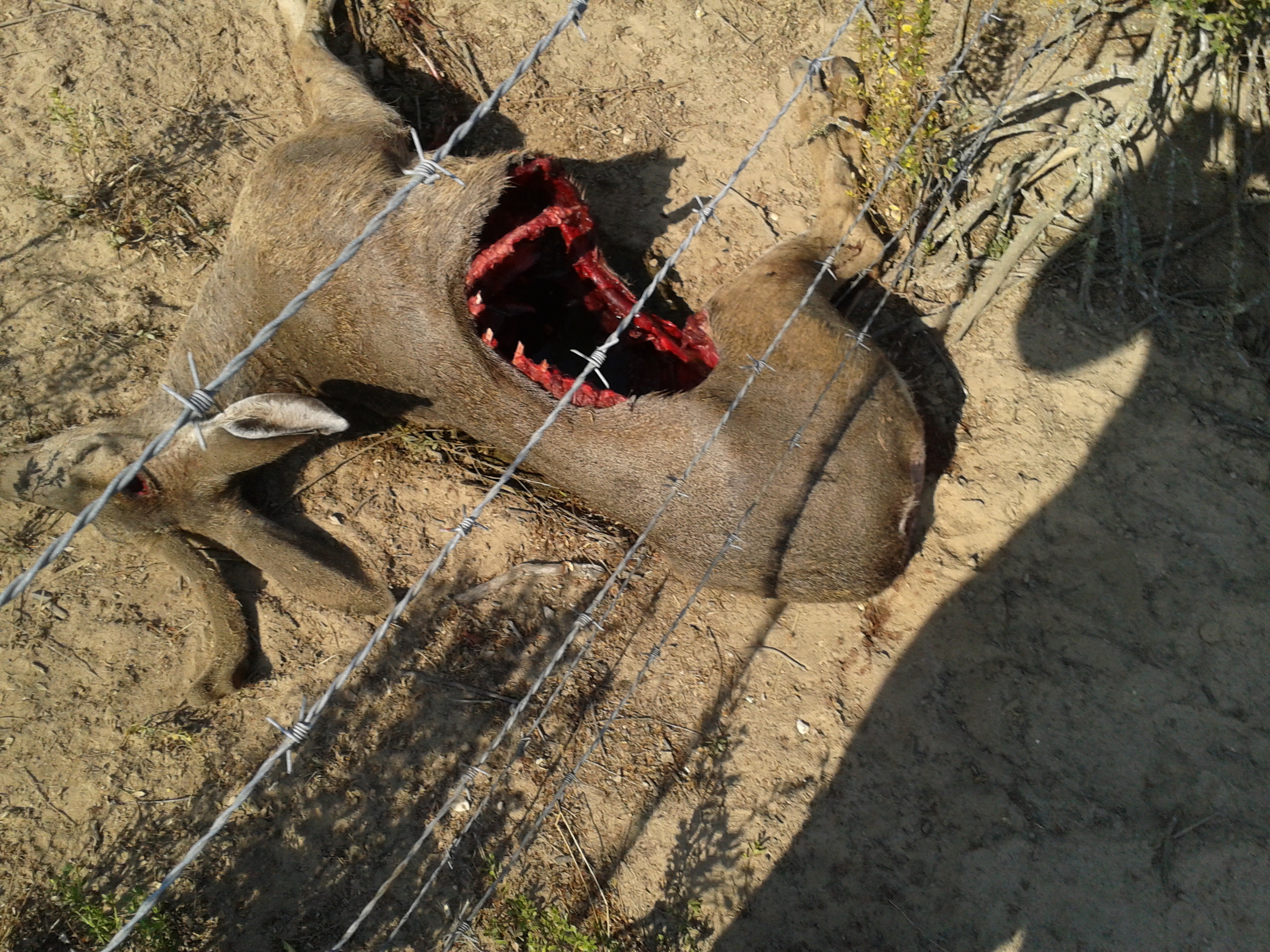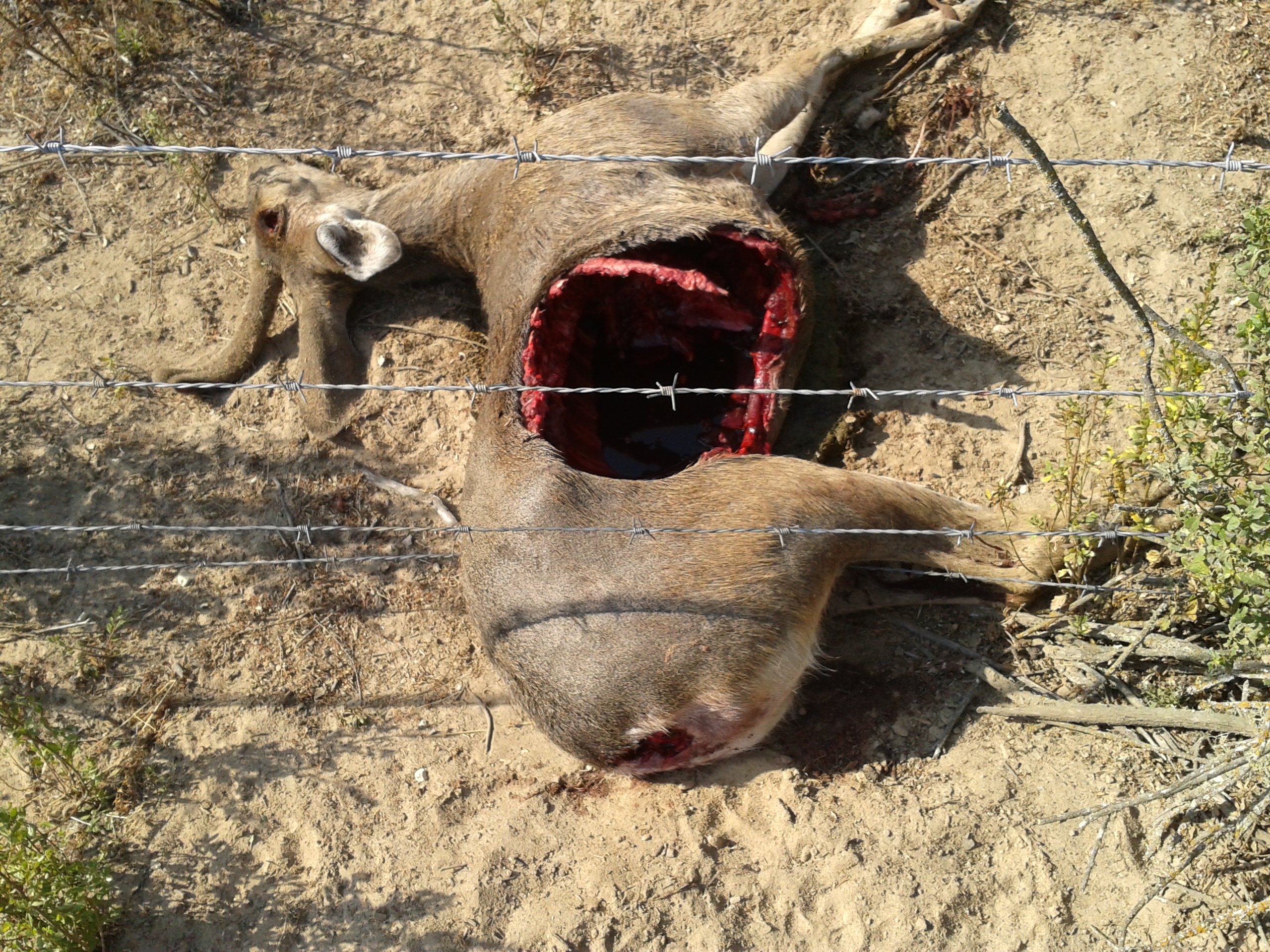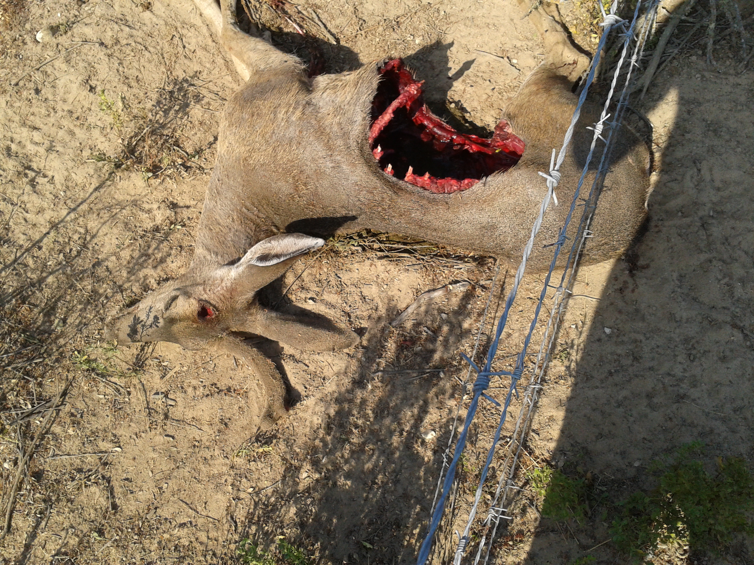 On my typical trail run this 19 Jul 2013 at 8:30 PST, when I came across this freshly killed carcass . The weather has been clear with no rain or wind to distort any tracks or wash away blood. The blood in the carcass is fresh. The animal is lodged on the lower strand of barbwire and not below it. There is no blood anywhere in the vicinity, as well as no drag marks. I have heard speculation from mountain lions, to coyotes, to bloat out.. I would be curious to what this is since it is near a populated area, and authorities are totally useless.