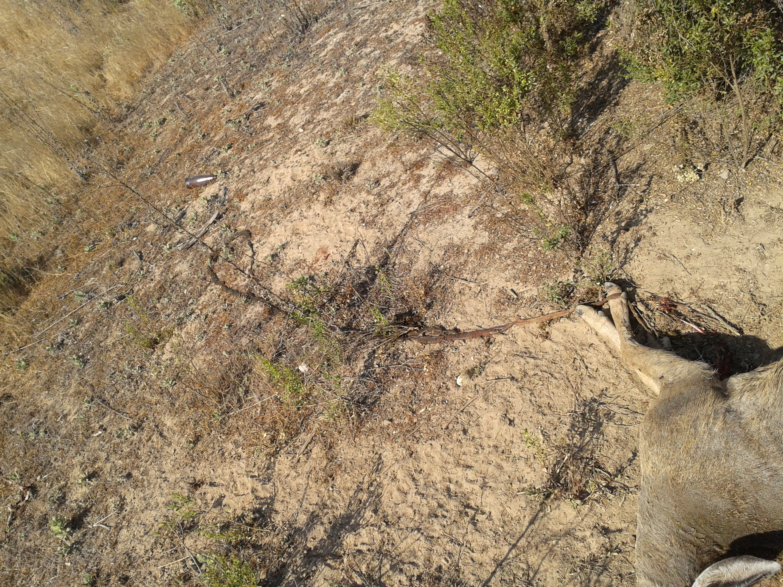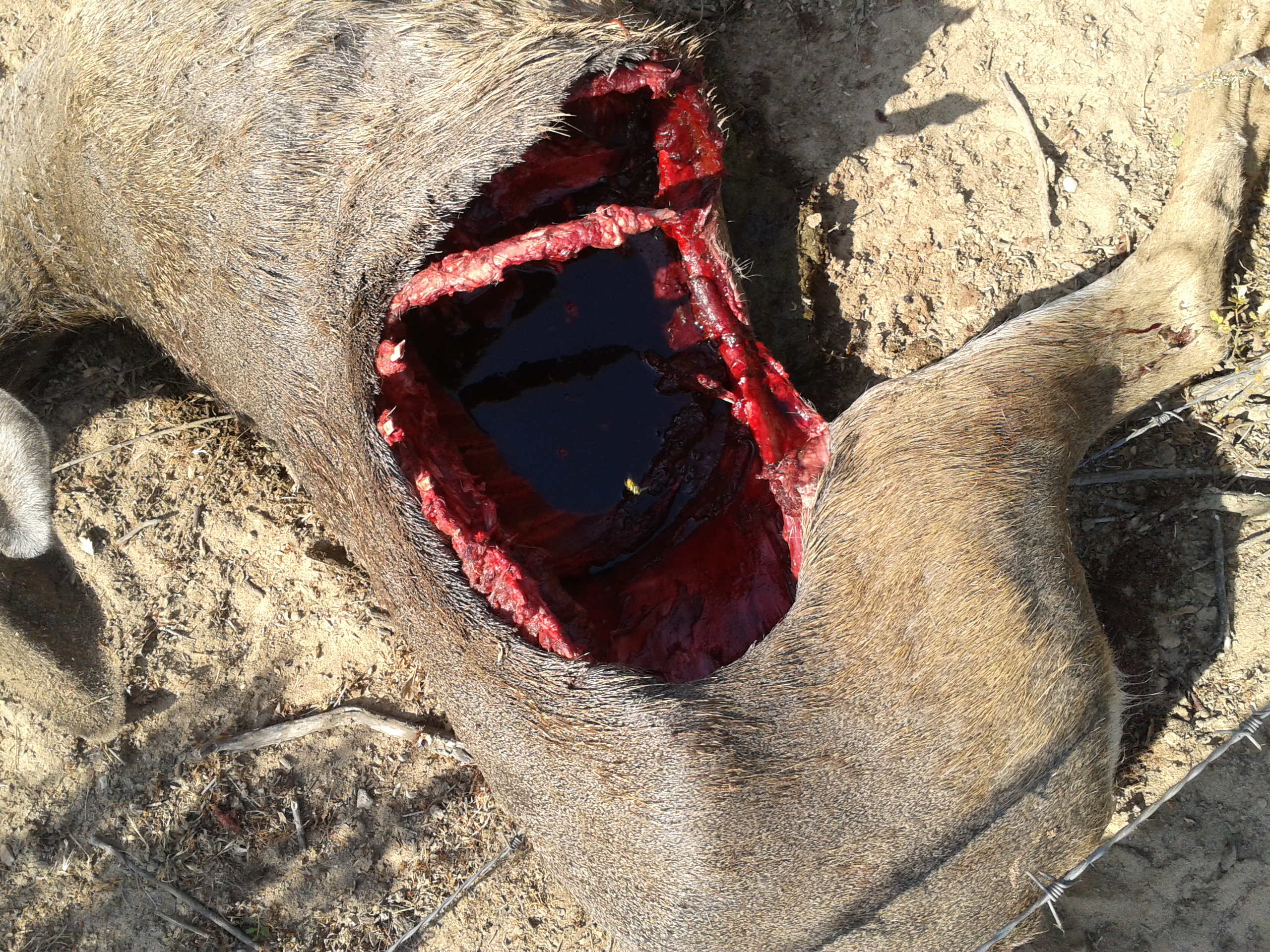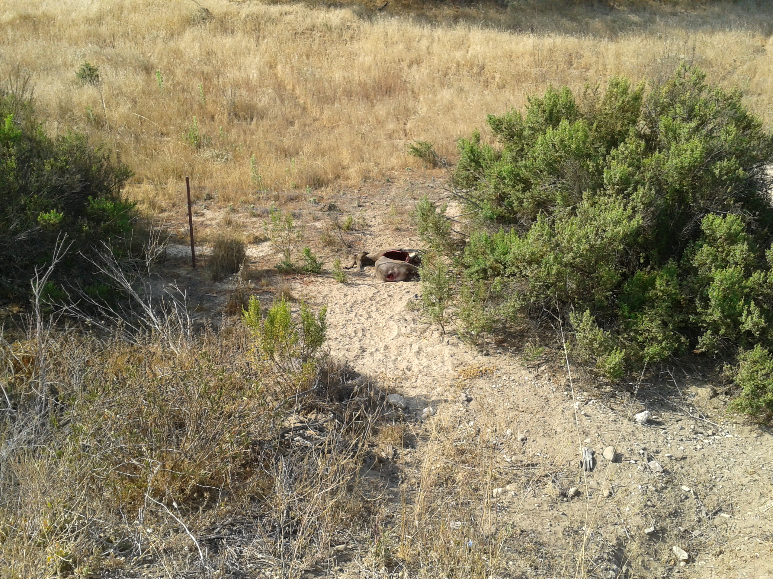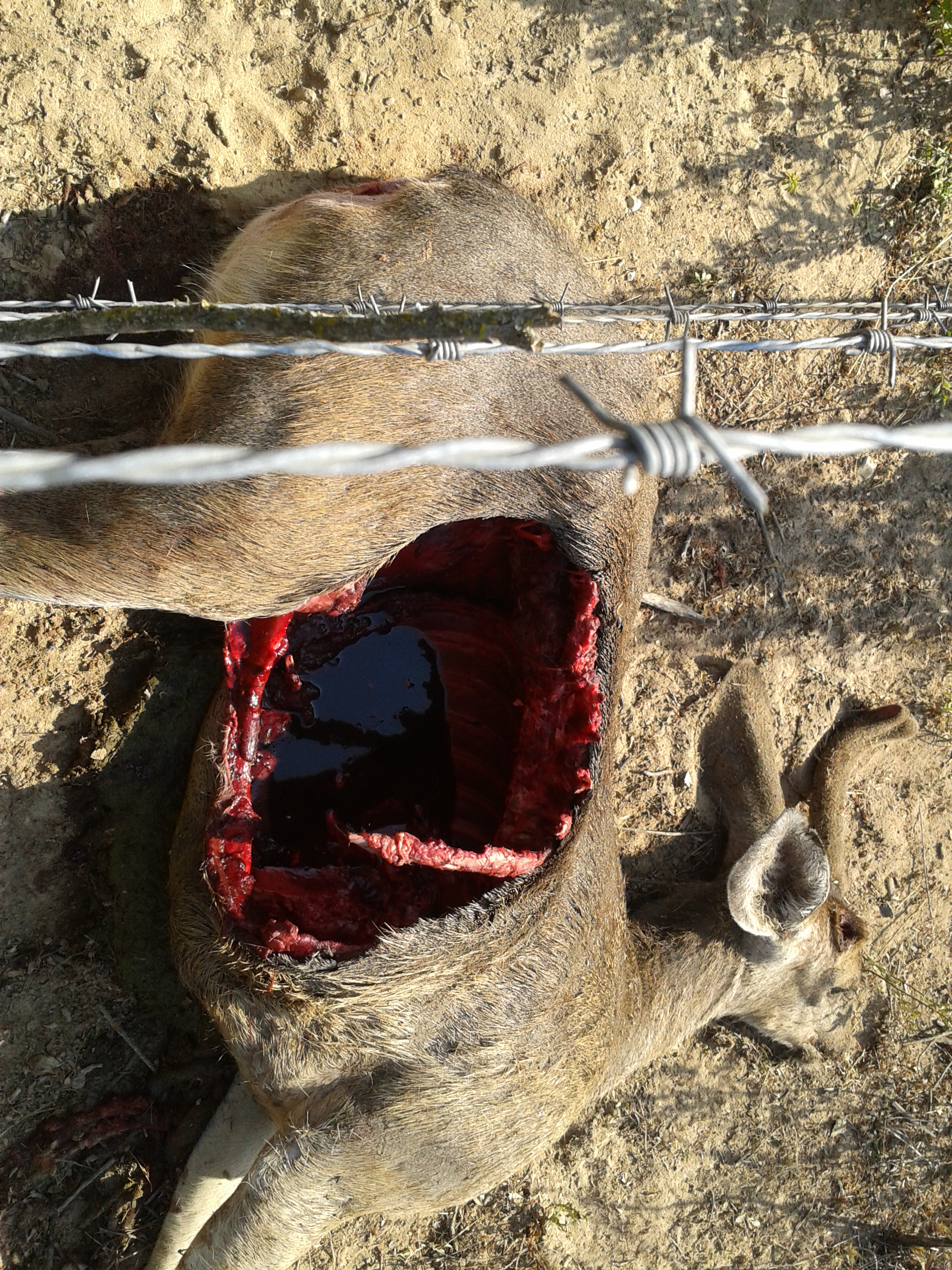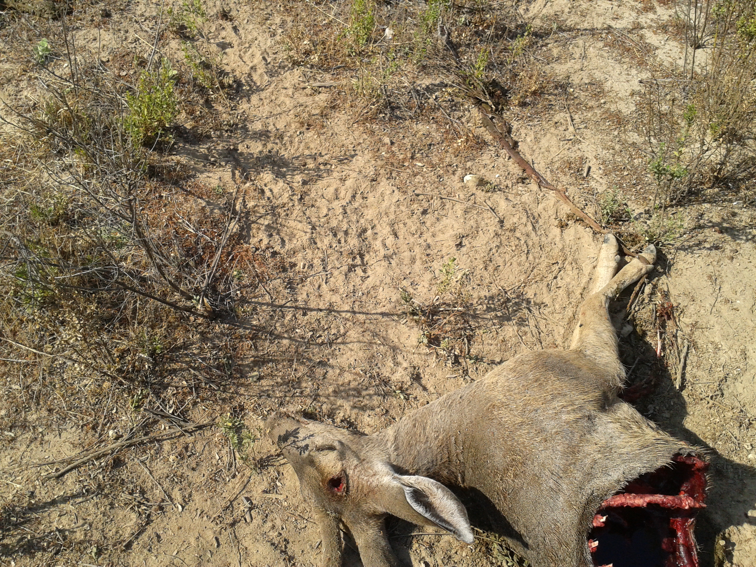 On my typical trail run this 19 Jul 2013 at 8:30 PST, when I came across this freshly killed carcass . The weather has been clear with no rain or wind to distort any tracks or wash away blood. The blood in the carcass is fresh. The animal is lodged on the lower strand of barbwire and not below it. There is no blood anywhere in the vicinity, as well as no drag marks. I have heard speculation from mountain lions, to coyotes, to bloat out.. I would be curious to what this is since it is near a populated area, and authorities are totally useless.