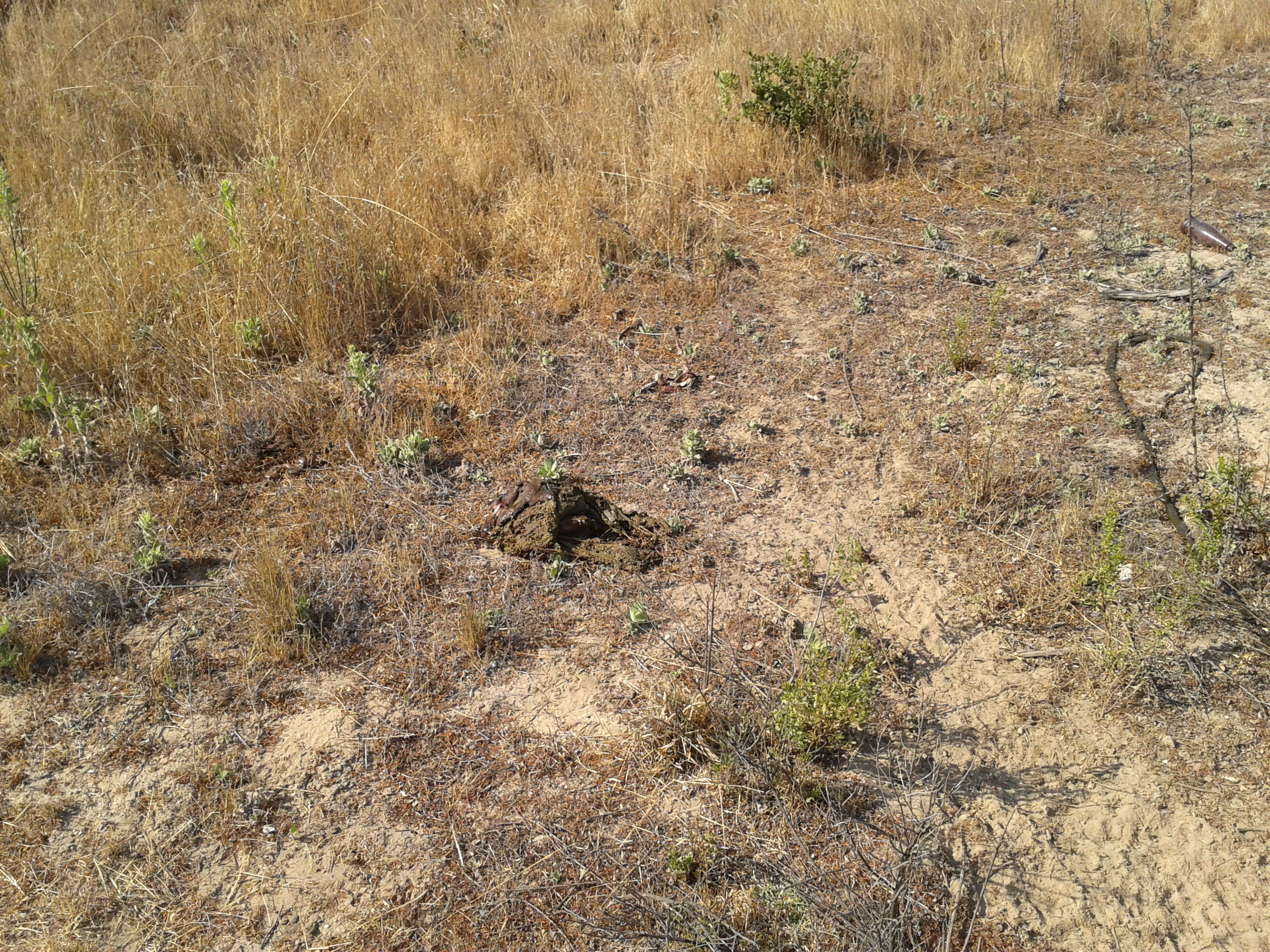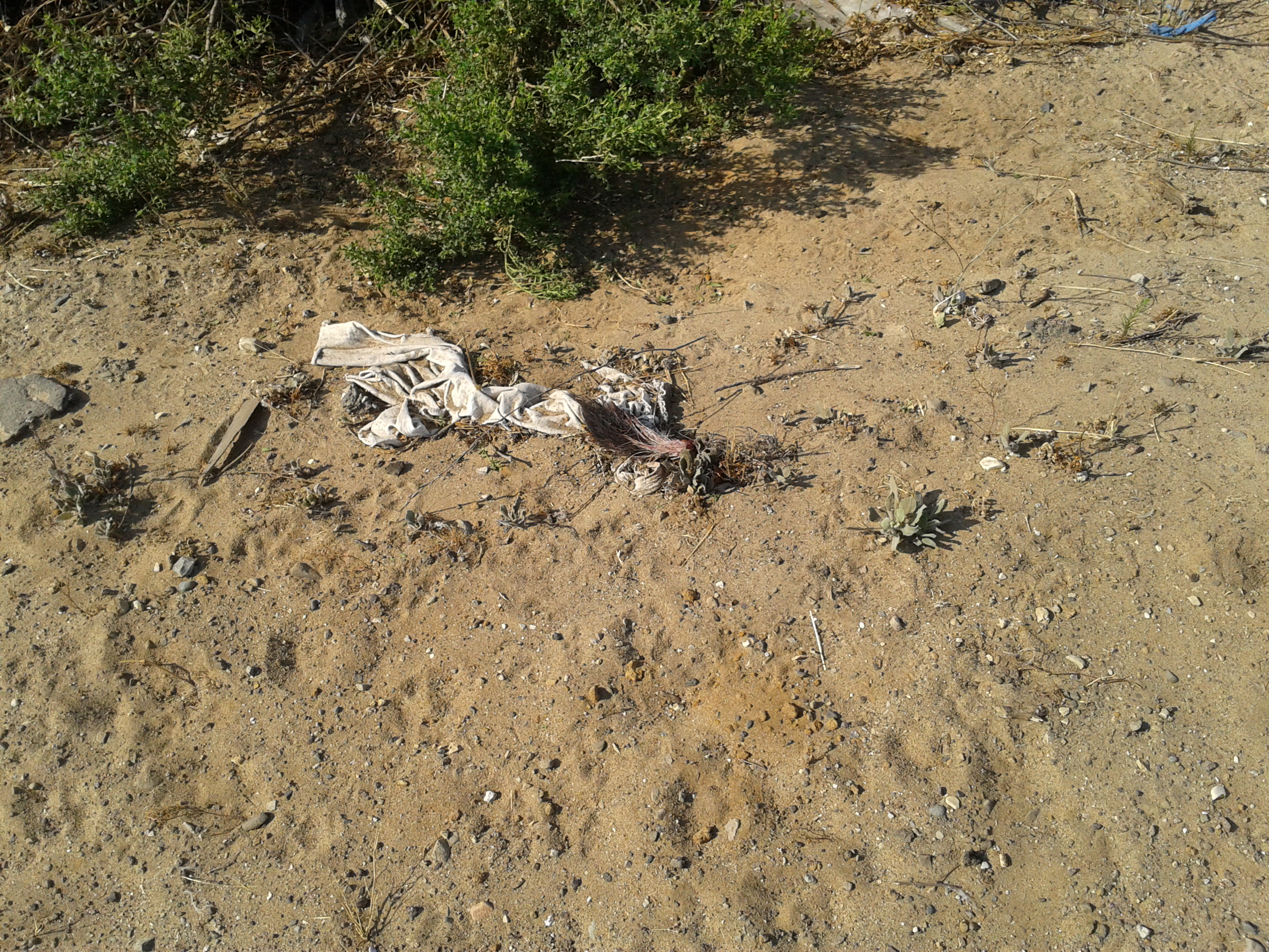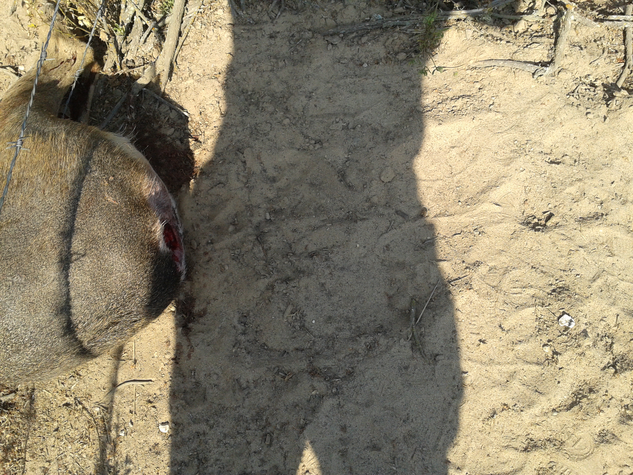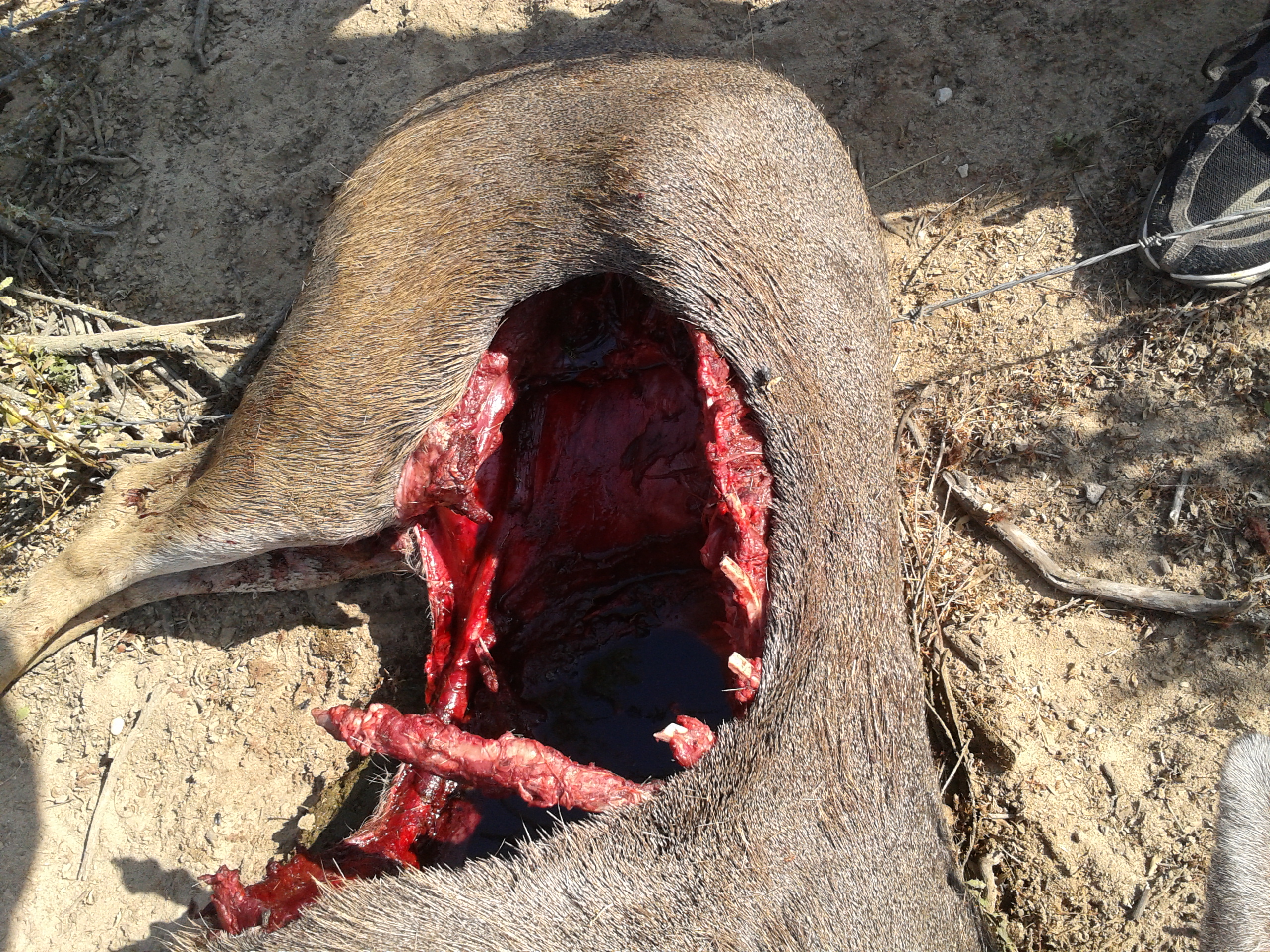 On my typical trail run this 19 Jul 2013 at 8:30 PST, when I came across this freshly killed carcass . The weather has been clear with no rain or wind to distort any tracks or wash away blood. The blood in the carcass is fresh. The animal is lodged on the lower strand of barbwire and not below it. There is no blood anywhere in the vicinity, as well as no drag marks. I have heard speculation from mountain lions, to coyotes, to bloat out.. I would be curious to what this is since it is near a populated area, and authorities are totally useless.