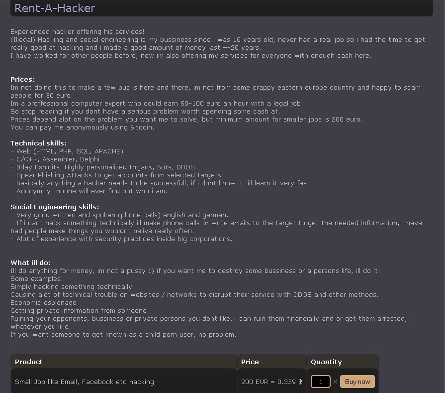 EEV: Nothing Special Here . Just posting up a few Common easy to find TOR posts, for our Non TOR users. Often the media makes solicitations for subversive dealings appear unusual or uncommon, but they are not. I will post web page snap shots for our readers to see. I will try not to expose web addresses or names of these sites unless requested by their web master. The validity of the sites, will always require confirmation. Since half of them are probably NSA fishing sites. The following are a couple just for fun, and I will post more later on. * Please feel free to refer other sites, that can be confirmed.