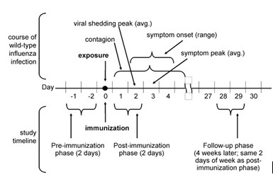 FIGURE 1. Timeline showing the course of wild-type influenza infection (top) and corresponding study phases (bottom). Infor- mation on the time course of wild-type influenza infection drawn from Coordinating Center for Infectious Diseases (4) and Carrat et al. (5).