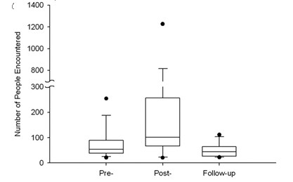 FIGURE 2. Number of people encountered is greater after immunization than before immunization or during follow-up. For each box plot, the lower and upper dots represent the 5th and 95th percentiles of the distribution, respectively; the whiskers represent the 10th and 90th percentiles, respectively; the lower and upper edges of the box represent the 25th and 75th percen- tiles, respectively; and the line through the center portion of the box is the median. Wilcoxon signed rank test comparing pre-immunization to post-immunization: z Z 3.08, n Z 35, p Z 0.002. Follow-up captures data on the same days of the week as post-immunization to rule out potential day-of-week confounds to social behavior. Wilcoxon signed rank test comparing pre-immunization to follow-up: z Z -1.90, n Z 26, p Z 0.058. The increase in social behavior seen post-immunization is therefore not confounded by day-of-week. respectively), and flirted with statistical significance (z Z 1.94, n Z 34, p Z 0.053).