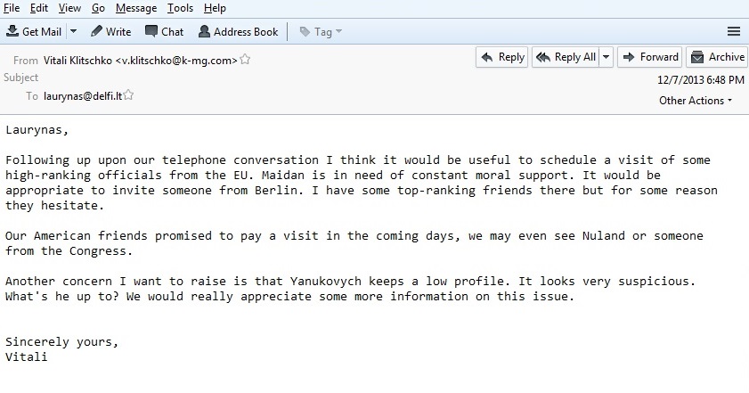 Laurynas, В продолжение нашей телефонной беседы должен отметить, что, по моему мнению, большую пользу принесет визит нескольких высокопоставленных официальных лиц Евросоюза. Майдан нуждается в постоянной моральной поддержке. Было бы неплохо пригласить кого-либо из Берлина. У меня там высокопоставленные друзья, однако, они по разным причинам они пока в нерешительности. В скором времени нас должны посетить наши американские друзья, возможно даже Нуланд или кто-нибудь из Конгресса. Должен отметить, что очень беспокоит сдержанная позиция Януковича. Все это очень подозрительно. Что он замышляет? Мы будем весьма признательны за любую дополнительную информацию по этому вопросу. С уважением, Виталий