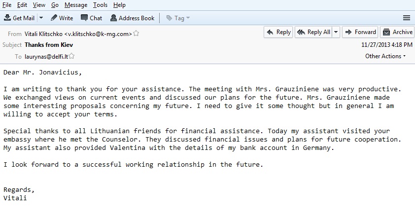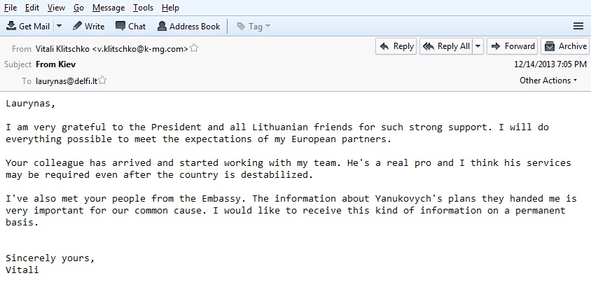 ——————— Laurynas, I am very grateful to the President and all Lithuanian friends for such strong support. I will do everything possible to meet the expectations of my European partners. Your colleague has arrived and started working with my team. He’s a real pro and I think his services may be required even after the country is destabilized. I’ve also met your people from the Embassy. The information about Yanukovych’s plans they handed me is very important for our common cause. I would like to receive this kind of information on a permanent basis. Sincerely yours, Vitali