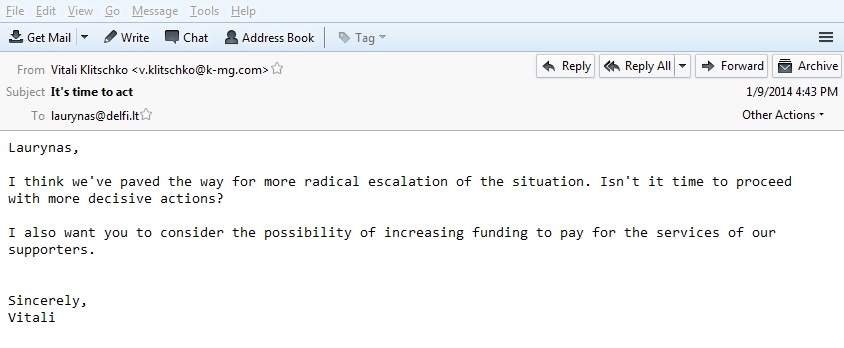 Laurynas, Я думаю, мы подготовили почву для радикализации развития ситуации. Разве не наступило время для решительных действий? Кроме того, прошу рассмотреть возможность увеличения финансирования для оплаты услуг наших сторонников. С уважением, Виталий