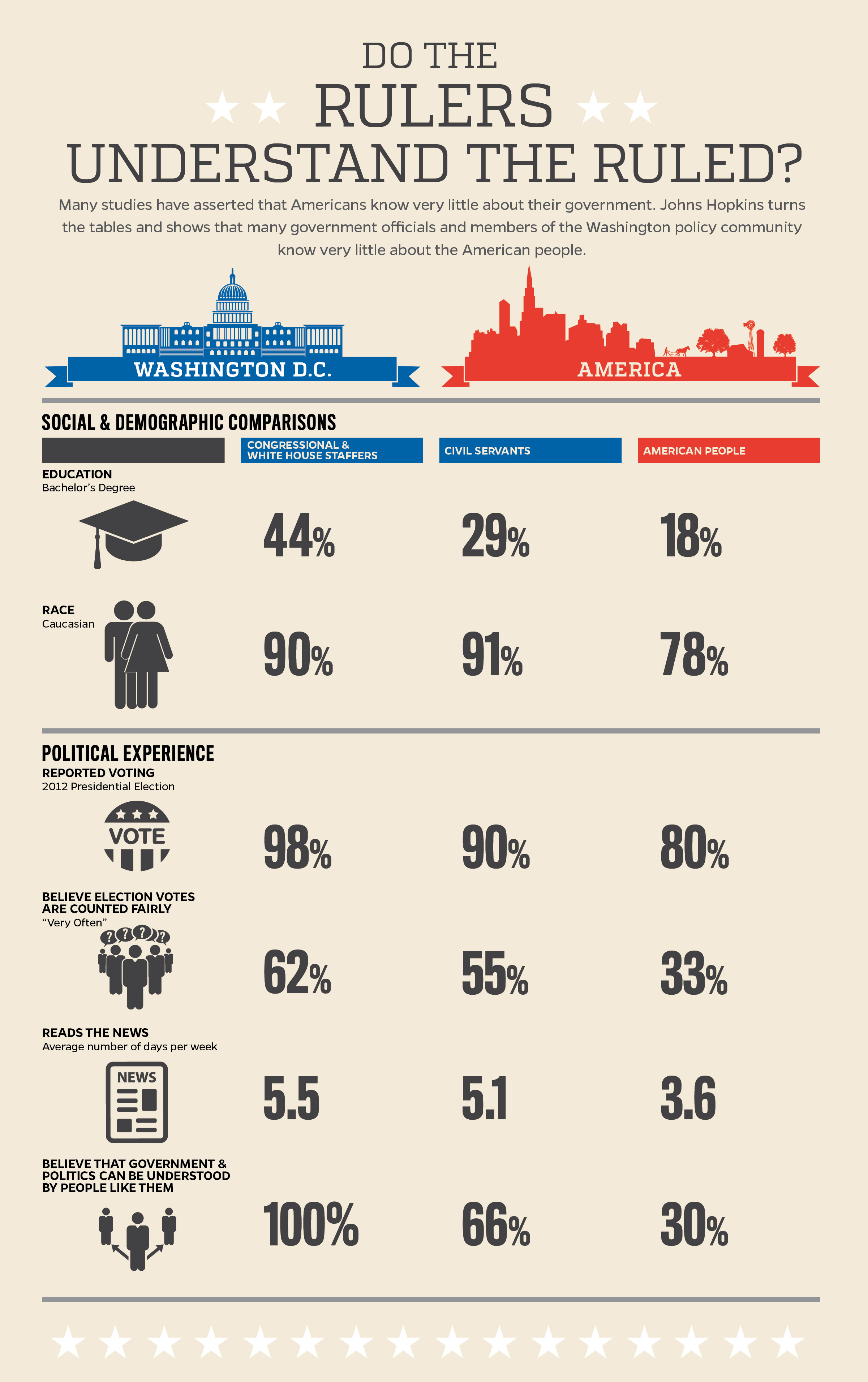 And while a hearty 100 percent of Congressional and White House staffers believe government and politics can be understood by people like them, only 30 percent of regular Americans feel that way.