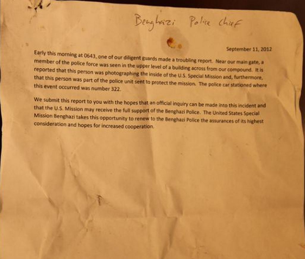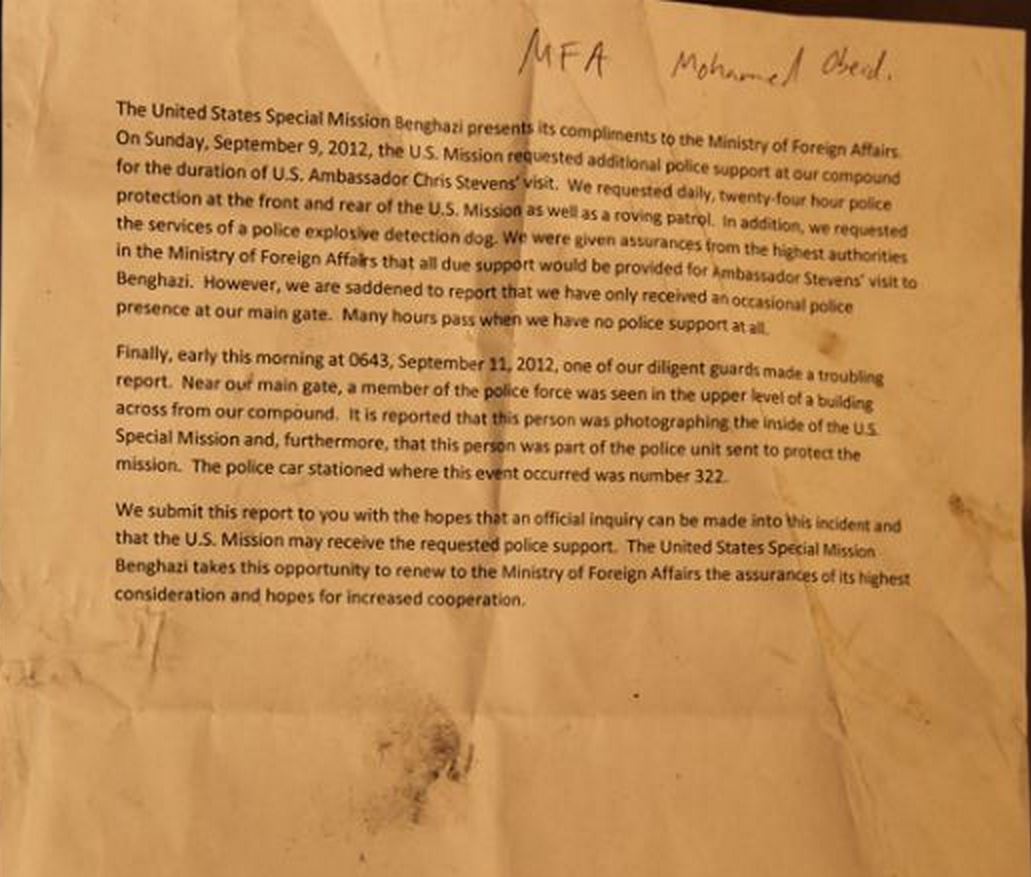 Requested Benghazi Pre-Attack and on site Documents By Ralph Turchiano on March 4, 2015 EEV: I am providing these documents from three primary sources in request to Benghazi.. (Foreign Policy (Yellowed Documents Found on Site), Judicial Watch, Daily Mail ) Full Judicial PDF: Here Share this: Click to share on Reddit (Opens in new window) Reddit Click to email a link to a friend (Opens in new window) Email Click to share on Facebook (Opens in new window) Facebook Click to share on X (Opens in new window) X Click to share on Tumblr (Opens in new window) Tumblr Click to share on Pinterest (Opens in new window) Pinterest Click to share on LinkedIn (Opens in new window) LinkedIn Click to print (Opens in new window) Print Like Loading...‹ For those wanting to know what HDR22 means in HDR22@ClintonEmail.comYou forgot to Wash the WayBack Machine ›Categories: Benghazi Related Articles Clinton’s Benghazi Phone Records -PDF via Judicial Watch Hillary Clinton’s E-mail From Sid “France’s client & Qaddafi’s gold” – Unclassified (FOIA) Clinton emails contained ‘need-to-know’ classified info Benghazi – The full time line of events as they unfolded in the media from 12 SEP 2012 through 28 MAR 2015