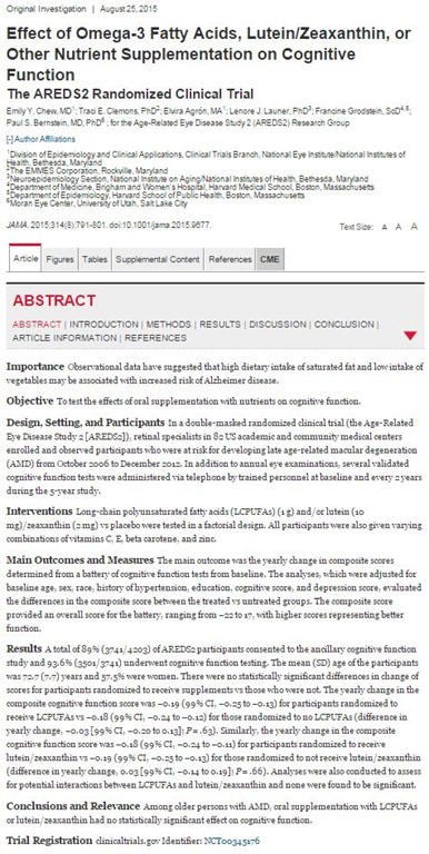 Age-Related Eye Disease Study 2 (AREDS2) Research Group. “Effect of Omega-3 Fatty Acids, Lutein/Zeaxanthin, or other Nutrient Supplementation on Cognitive Function: The AREDS2 Randomized Clinical Trial.” JAMA, published online August 25, 2015.