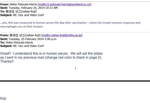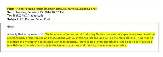 In Dr Helen Petousis-Harris’ own words, “as many cytokines have localised activity it is possible that increased activity is not captured systemically.” Nevertheless, Dr. Helen Petousis-Harris managed to satisfy Dr. Nabae that she only measured the cytokines in the serum and found no increase of cytokines after HPV vaccination and her data did not really contradict the findings presented by their expert which confirmed increases in cytokines at the site of HPV vaccine injection. So both Dr. Nabae and Dr. Petousis-Harris decided to use “no increase in serum” as evidence for “No elevation of any cytokine associated with reactogenicity” as illustrated in the following email exchange.