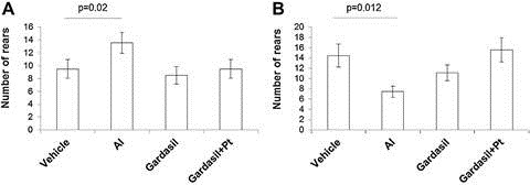 Fig. 1. Effects of Al, Gardasil and Gardasil + Pt toxin injections on exploratory activity and anxiety in C57BL/6 female mice as evaluated by the staircase test. Results are presented as the number of rears (mean ± SEM) during a 3 min testing period. (A) Three months post-injection; (B) six months post-injection.