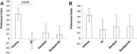 Fig. 2. Effects of Al, Gardasil and Gardasil + Pt toxin injections on spatial memory in C57BL/6 female mice as evaluated by the Y maze test. Results are presented as a mean ± SEM preference index for spending time in a new arm (time in the new arm − time old arm/time in the new arm + time in the old arm). (A) Three months post-injection; (B) six months post-injection.