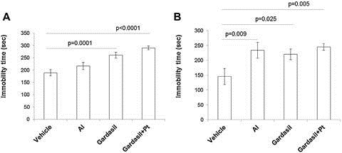 Fig. 3. Effects of Al, Gardasil and Gardasil + Pt toxin injections on floating time in C57BL/6 female mice as evaluated by the forced swimming test (FST). Results are presented as duration in seconds (mean ± SEM) of immobility, defined as the absence of escape-oriented behaviors, such as swimming, jumping, rearing, sniffing or diving, recorded