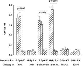 Fig. 4. Titers of serum antibodies one month post injection with either Al (A), Gardasil (G), Gardasil + Pt toxin (Gp) and vehicle (V). A home-made ELISA was used to detect the levels of anti-HPV, anti-Al hydroxide (Alum), anti-mouse brain protein extract, anti-mouse brain phospholipid (PL) extract, anti-dsDNA, and anti2glycoprotein-I (2GPI) antibodies in the sera of immunized mice. Pools of sera (n = 5 per treatment group) were used as samples. All sera samples were assayed in triplicate. Data are presented as mean OD 405 ± SEM.