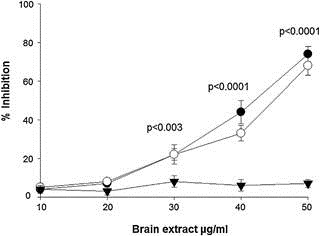 The binding of anti-HPV antibodies from the sera from the two treatment groups immunized with Gardasil to HPV L1 antigens, was significantly inhibited by the mouse brain protein extract in a dose dependent manner in comparison to Al-injected mice whose sera were negative for anti-HPV antibodies (Fig. 5).
