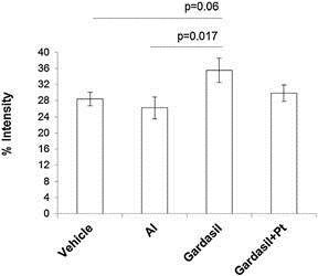 One month post injection of either Al, Gardasil and Gardasil + Pt, the profile of serum antibodies was analyzed at dilution of 1:200. Elevated levels of antibodies recognizing Gardasil components, including the HPV L1 capsid protein of HPV types 6, 11, 16 and 18 (p < 0.002), as well as anti-brain protein extract (p < 0.002) and antibrain phospholipid extract antibodies (p < 0.001) were observed in the two groups of mice that received the HPV vaccine(Fig. 4. The titers of anti-HPV antibodies, anti-brain protein extract and anti-brain phospholipid extract antibodies were reduced after two months (data not shown). No elevation in the titers of anti-Alhydroxide, anti-dsDNA and anti-2GPI antibodies, were detected in the sera of any of the four treatment groups of mice (Fig. 4).